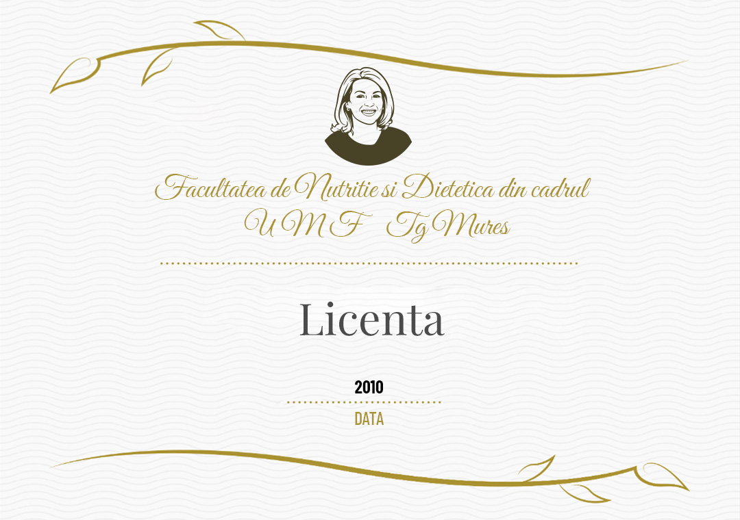Are licente obtinute atat la Facultatea de medicina generala Carol Davila cat si la Facultatea de nutritie si dietetica a UMF Tg Mures, la care se adauga studii de MASTER in stiintele nitritiei la Universitatea Babes Bolyai din Cluj.